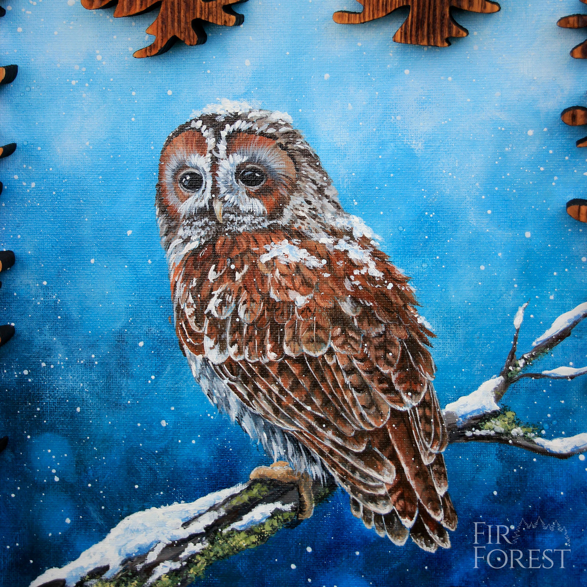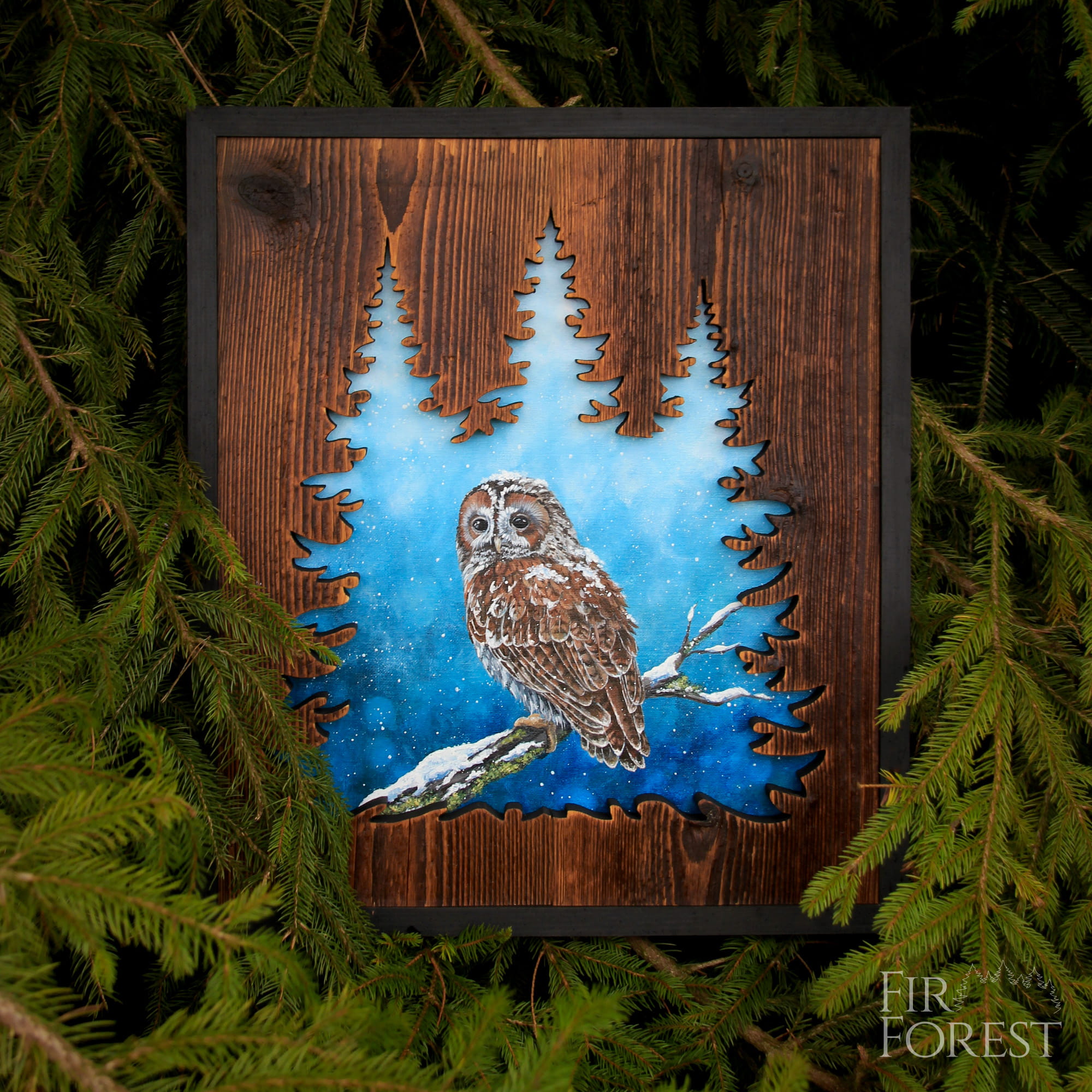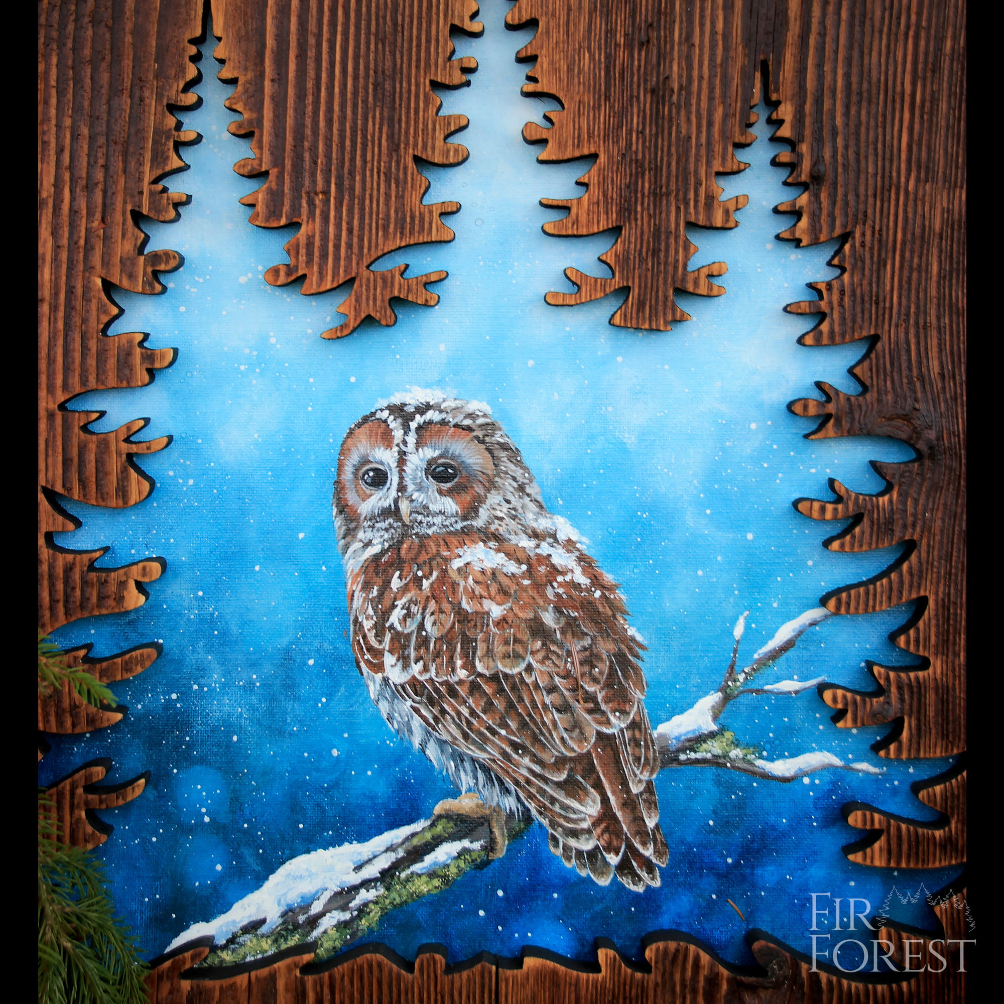 Puszczyk zwyczajny jest jest jedną z najpospolitszych sów w Polsce. Występuje licznie w lasach Beskidów i Bieszczad, tak jak w całych Karpatach. Zimą spotkać go można siedzącego na bezlistnych gałęziach drzew, gdzie na otwartej przestrzeni poluje na gryzonie. Sowy zimą są łatwe do obserwacji, głownie przez aktywność w dzień oraz brak liści w których mogą się ukryć. Malowany puszczyk w połączeniu z drewnem będzie pasował idealnie jako obraz do domku letniskowego, agroturystyki w Bieszczadach czy chatki pod lasem w Beskidzie.