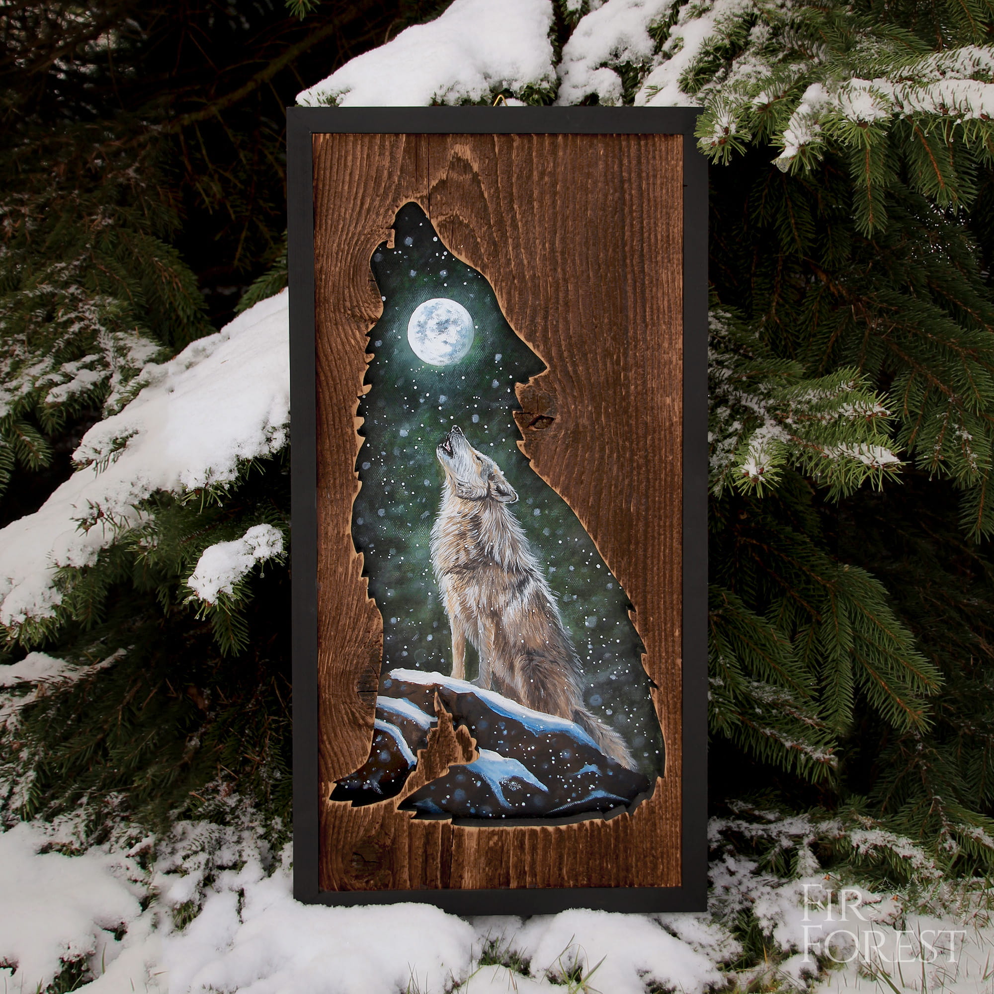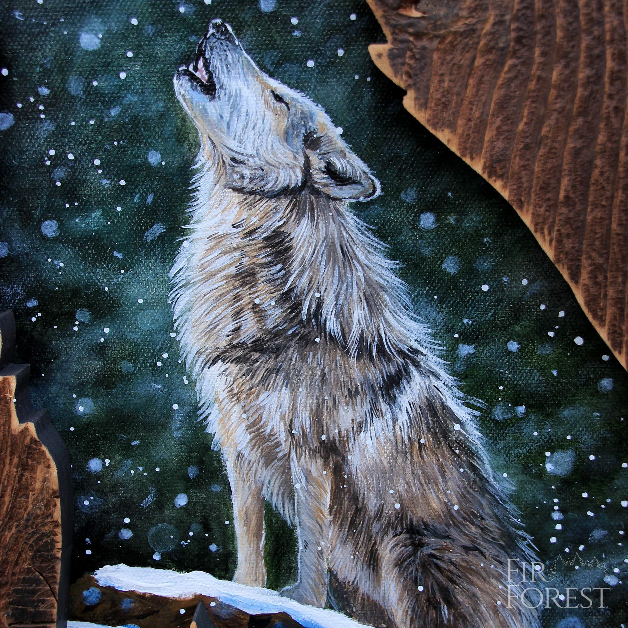 Wyjący do księżyca wilk w mroźny zimowy wieczór to wyobrażenie, które mieszka w naszych głowach ilekroć pomyślimy o tych zwierzętach. Kojarzą się ze strachem, siłą, mrozem, mrocznym lasem i pełnią... Nawiązując do dawnych wyobrażeń namalowałam niniejszy obraz. Mroczny las, zima i wilk, król nocy.